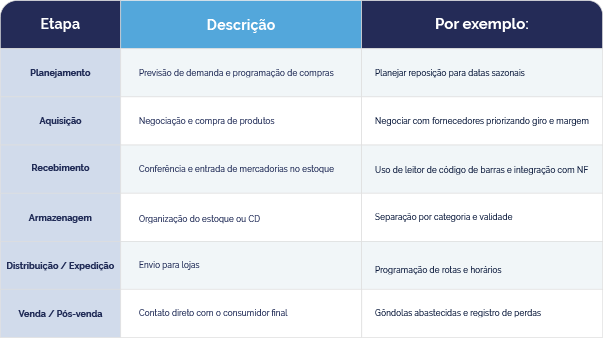 A cadeia de suprimentos no varejo supermercadista segue um fluxo contínuo, composto por etapas que se conectam